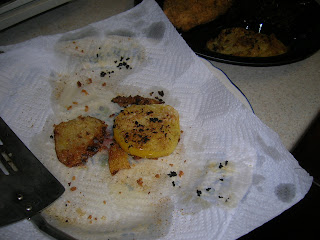 I've been bogged down with yet more car trouble lately, and so I've been too preoccupied with other things to write in the last few days. But I did keep a green tomato from the farmers' market from going to waste with a little bit of panko bread crumbs and some flour/cornmeal/bread crumb mixture (generously sprinkled with Old Bay). I had wanted to dip it in an egg wash, but I have rarely done that with green tomatoes. The end result was pretty tasty, even though a few crumbs were slightly burnt.